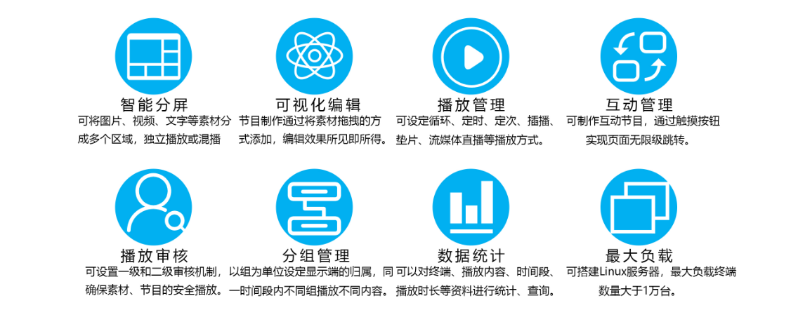 詳盡的終端配置信息,定時(shí)開關(guān)機(jī),遠(yuǎn)程更改視頻輸出類型及分辨率;統(tǒng)一實(shí)時(shí)監(jiān)控;故障 及時(shí)告警,實(shí)時(shí)反饋當(dāng)前播放內(nèi)容及音量控制;終端程序更新可通過(guò)系統(tǒng)自動(dòng)升級(jí)。