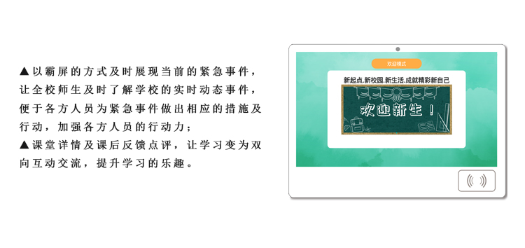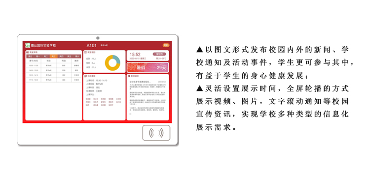 智慧班牌是智慧校園建設(shè)不斷發(fā)展的產(chǎn)物,是教育信息化改革的部分體現(xiàn)。它針對教改需求和學(xué)校使用場景的綜合考慮融合了教學(xué)需求的方方面面,加入了更多的實(shí)用功能,讓班牌更加靈活豐富。智慧班牌是以云平臺、云服務(wù)器為基礎(chǔ),采用區(qū)域?qū)嵤┕芾?,?shí)現(xiàn)大數(shù)據(jù)、資源共享,有利于學(xué)校信息化建設(shè)和交流,也更易操作管理、數(shù)據(jù)更安全可靠,有效降低學(xué)校使用成本;平臺系統(tǒng)不斷優(yōu)化升級,版本升級云端控制,更貼合學(xué)校教育改革需求。